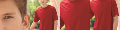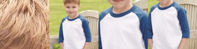 50% polyester, 50% cotton jersey knit; New fit for greater comfort; Contrast color 1x1 rib-knit collar; Contrast color rib-knit collar and raglan sleeves; Double-needle hemmed sleeves; Three-quarter length raglan sleeves; Serged fishtail bottom for added length;