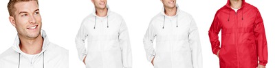 1.7 oz/yd2 / 58 gsm, 100% polyester taffeta; Water-resistant finish; Center front coil zipper with autolock slider; Lower front concealed zippered pockets; Elasticized cuffs; Rollaway adjustable hood; Adjustable shockcord at hem;