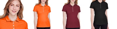 100% polyester wicking knit with True Hue Technology® that helps prevent dye migration; Moisture-wicking; Ladies' fit; Updated tailored fit; Tagless label; Outside locker label; Designed to be NFHS compliant;