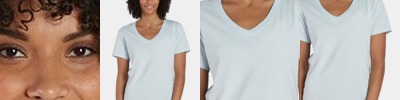 100% polyester wicking knit with True Hue Technology® that helps prevent dye migration; Moisture-wicking; Tear away label; Ladies’ fit; V-neck collar;