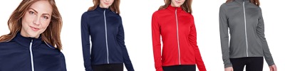 10 oz., 70% polyester 30% quilted jersey; polyester filling; full front zippered placket; drop shoulder; princess seams and side pockets;
