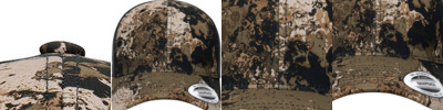 100% polyester camo print front and mesh back; No Sweat™ moisture-wicking sweatband ; structured, mid-profile; tonal print overlay of topographical pattern; plastic snapback closure;