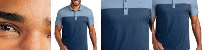 Bold colorblocking on the chest, sleeves and back yoke give this moisture-wicking polo instant appeal whether you're going 18 or going into the office. 4.3-ounce, 57/43 cotton/poly pique Moisture-wicking Self-fabric anti-curl collar with collar stand Forward shoulder 3-button placket Dyed-to-match buttons (Dark Smoke buttons on Deep Black/Charcoal Heather) Straight hem Tag-free label