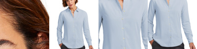 Add a touch of sophistication with this versatile blouse, made from a soft satin fabric featuring a subtle sheen. Designed for a classic fit with traditional flair. 4.1-ounce, 100% polyester satin Anti-static finish Open collar French front placket Inverted box pleat Single-button cuffs Pearlized buttons