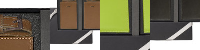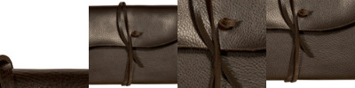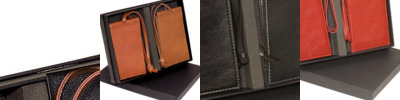 - Holds ID/business card behind acetate viewing window on back panel hidden by leather flap