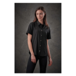 Short sleeve shirt built for work or play with ultralightweight, quick to dry, stretch-woven dobby fabric. Featuring a tailored collar and contoured seaming for maximum comfort. The women’s invisible zippered pocket conveniently secures personal items.