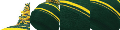 - Two layers of knit featuring a two-color pom accent