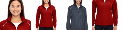 body: 6.49 oz./yd2 / 220 gsm, 100% polyester mélange jersey bonded with fleece; contrast: 6.49 oz./yd2 / 220 gsm, 100% polyester jersey bonded with fleece; Center front coil zipper with semi autolock slider ; Front and back princess seam for flattering feminine fit; Lower pockets with hidden snap closure; Tonal coverstitch details on armholes and shoulder seams;