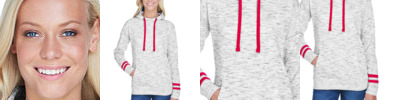 7.25 oz. 60% cotton, 40% polyester melange fleece; Scuba hood; Contrast drawcords; Front pouch pocket; Rib waist & cuffs; Two contrast stripes on each sleeve;