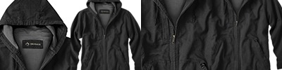 100% polyester, all season soft shell; Wind resistant; Water resistant, DWR finish; Breathable; Thumbhole cuff feature for secure fit ; Auto lock zipper with easy grab puller; Media port; 4-way stretch; Media port; Adjustable three-piece hood designed to contour for a comfortable fit; Zippered chest and hand pockets;