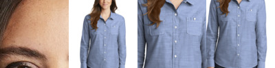 Washed chambray and off-white contrast stitching give this casual garment washed shirt an authentic, laid-back look. 3-ounce, 100% cotton slub chambray Open collar Back shoulder pleats Double chest pockets with buttons Rounded double-button cuffs