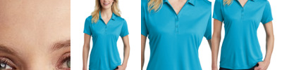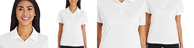 100% polyester heathered wicking knit top body, collar and sleeves ; 100% polyester wicking knit solid bottom body ; Wicks moisture away from the body ; Ladies' fit ; Pad print label ; Contrast self-fabric Johnny collar, placket, and yoke ; Contrast set-in sleeves ;